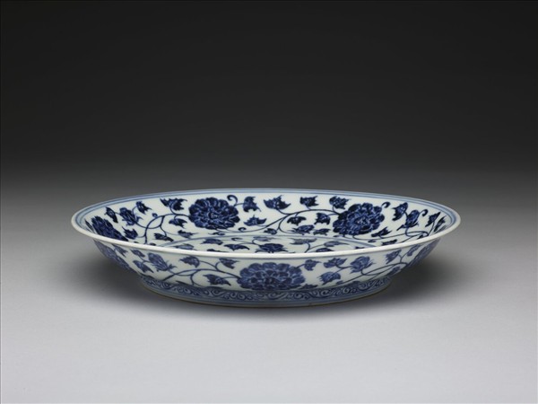 撇口,淺壁,矮圈足。盤心內凹外凸,內面畫一折枝雙芙蓉花,內外壁為轉枝芙蓉花各一周。青花濃艷,深處呈褐綠結晶疵斑,釉內密佈大小氣泡。胎骨勻薄,質堅細膩。底青花書「大明宣德年製」二行六字楷款,外加雙圈。