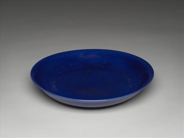 侈口,淺壁弧形,矮圈足。盤心及外壁分劃趕珠雲龍紋五條,底邊劃蓮瓣紋一周。胎質較薄,內外滿施霽青釉,盤底純白。底有青花書「大明嘉靖年製」六字二行楷款,外加雙圈。