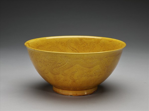 黃釉劃花雲龍紋碗