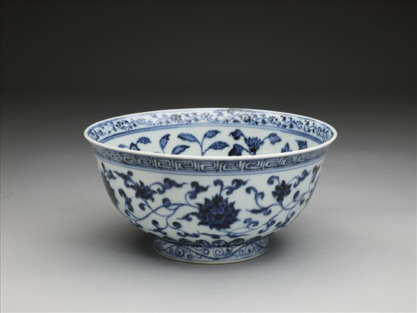 侈口窄唇,深壁,矮圈足。碗內口唇上畫轉枝菊花一周,內壁畫纏枝四季花五朵,碗心畫番蓮一枝。外面口沿下畫回紋一道,周壁畫纏枝四季花五朵,底邊畫蓮瓣紋,足圈畫卷草紋。內外花紋間加飾青線十一道。