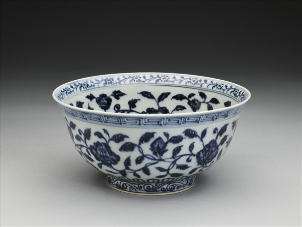 侈口窄唇,深壁,矮圈足。碗內口唇上畫轉枝菊花一周,內壁畫纏枝四季花五朵,碗心畫番蓮一枝。外面口沿下畫回紋一道,周壁畫纏枝四季花五朵,底邊畫蓮瓣紋,足圈畫卷草紋。內外花紋間加飾青線十一道。