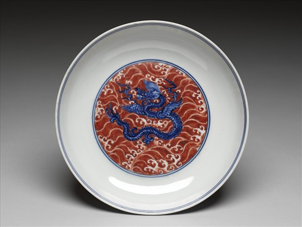 青花釉裡紅波濤海獸紋盤