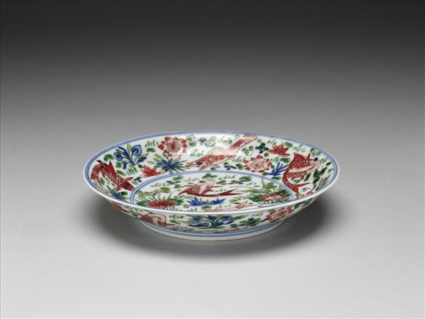 侈口窄唇,淺壁,矮圈足。薄胎白釉,盤心及內外壁滿畫青花水藻、綠葉紅蓮花,加飾紅魚十二尾,內外口足間分飾青線八道。