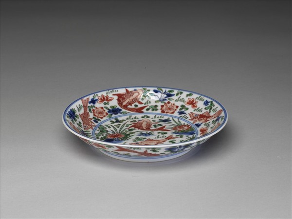 侈口窄唇,淺壁,矮圈足。薄胎白釉,盤心及內外壁滿畫青花水藻、綠葉紅蓮花,加飾紅魚十二尾,內外口足間分飾青線八道。
