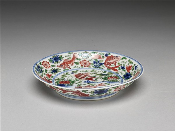 侈口窄唇,淺壁,矮圈足。薄胎白釉,盤心及內外壁滿畫青花水藻、綠葉紅蓮花,加飾紅魚十二尾,內外口足間分飾青線八道。