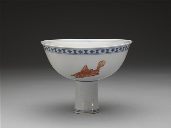 青花描紅魚紋高足碗