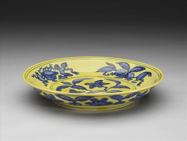 侈口窄唇,淺壁,矮圈足。內壁畫青花石榴、葡萄等四種果實,盤心畫玉蘭一枝。外壁畫轉枝牡丹花八朵。內外分畫青線十道。原為白地青花,加施黃釉一層。底有青花書「大明正德年製」二行六字楷款,外加雙圈。