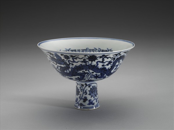 撇口,深壁,高足唯侈,足中空。外壁飾雙龍穿行蓮花枝葉之中,高足畫纏枝蓮花三朵,口沿內外、高足上下各飾青線二道。內壁青花書藏文吉祥經文一周,意為「日平安,夜平安,陽光普照皆平安,日夜永遠平安泰,三寶(佛、法、僧)護佑永平安」。碗心一梵文種子字為「吽」,外加雙圈。青花釉色勻深,多處帶褐綠、褐黃及鐵褐疵斑,白釉瑩潤。胎骨勻薄,高足稍厚;圈足露胎,質堅細膩,胎釉間泛淺橘色。器底圈足內青花書「宣德年製」二行四字楷款。此碗款識「年」字上釉後不慎擦損,故字體不全。