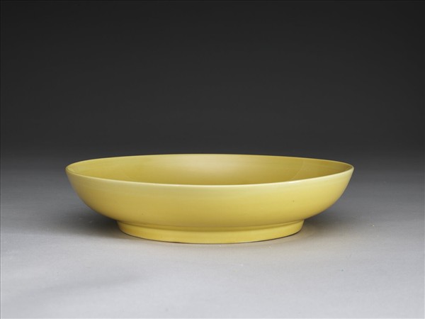 敞口窄唇,淺壁,矮圈足。胎骨稍厚,器內外壁滿施嬌黃釉,盤底純白,樸素無紋飾。底有青花書「大明嘉靖年製」二行六字楷款,外加雙圈。