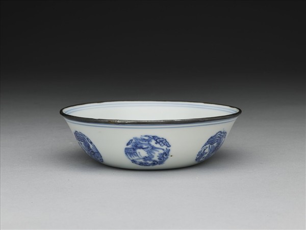 侈口,淺壁,底心凸起,淺圈足。薄胎白釉,碗心畫團形大小鳳凰一對,周壁純白無紋飾。外壁畫團鳳六枚,口足內外加飾青線七道。口沿加鈐銀邊。底有青花書「嘉靖辛亥素居家藏」二行八字楷款,外加雙圈。