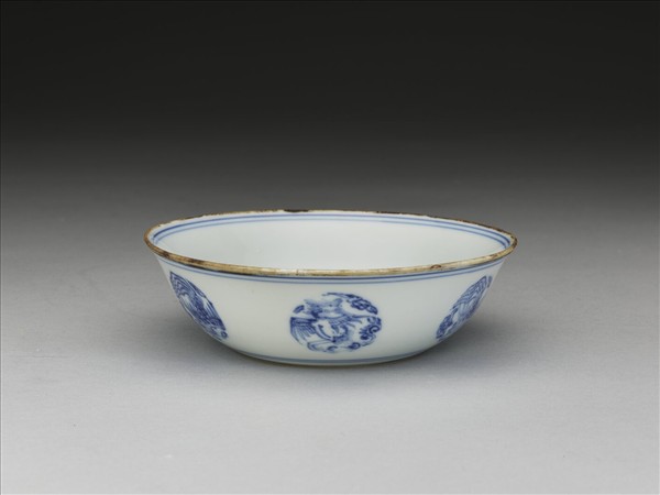 侈口,淺壁,底心凸起,淺圈足。薄胎白釉,碗心畫團形大小鳳凰一對,周壁純白無紋飾。外壁畫團鳳六枚,口足內外加飾青線八道。口沿加鈐銀邊。底有青花書「嘉靖辛亥素居家藏」二行八字楷款,外加雙圈。