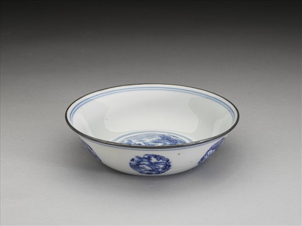 侈口,淺壁,底心凸起,淺圈足。薄胎白釉,碗心畫團形大小鳳凰一對,周壁純白無紋飾。外壁畫團鳳六枚,口足內外加飾青線八道。口沿加鈐銀邊。底有青花書「嘉靖辛亥素居家藏」二行八字楷款,外加雙圈。