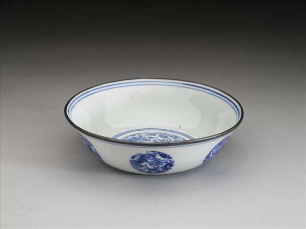 侈口,淺壁,底心凸起,淺圈足。薄胎白釉,碗心畫團形大小鳳凰一對,周壁純白無紋飾。外壁畫團鳳六枚,口足內外加飾青線八道。口沿加鈐銀邊。底有青花書「嘉靖辛亥素居家藏」二行八字楷款,外加雙圈。