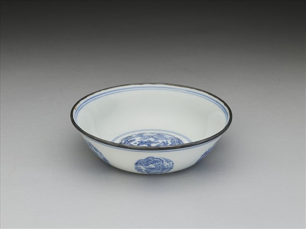 侈口,淺壁,底心凸起,淺圈足。薄胎白釉,碗心畫團形大小鳳凰一對,周壁純白無紋飾。外壁畫團鳳六枚,口足內外加飾青線八道。口沿加鈐銀邊。底有青花書「嘉靖辛亥素居家藏」二行八字楷款,外加雙圈。