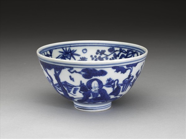 碗心畫茶花一朵,周壁飾松竹梅,內部自口沿至碗心共畫青線六道。外壁繪八仙祝壽,壽星持靈芝,旁立一鶴,桌上陳設一香爐。人物以外的背景皆簡單地勾勒出來。底白釉,中心微凸,青花楷書「大明嘉靖年製」,外加雙圓圈。