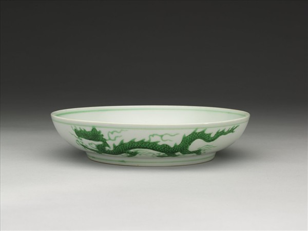 敞口,淺壁弧形,矮圈足。盤心與外壁刻畫雲龍三條,外壁隙地淺劃雙珠、波濤紋。薄胎白釉,龍紋加填綠彩,口足內外分畫綠線四道。底有青花書「大明弘治年製」二行六字楷款,外加雙圈。