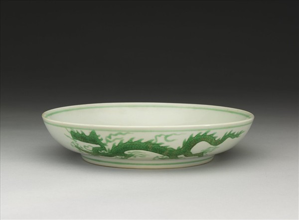 敞口,淺壁弧形,矮圈足。盤心與外壁刻畫雲龍三條,外壁隙地淺劃雙珠、波濤紋。薄胎白釉,龍紋加填綠彩,口足內外分畫綠線四道。底有青花書「大明弘治年製」二行六字楷款,外加雙圈。