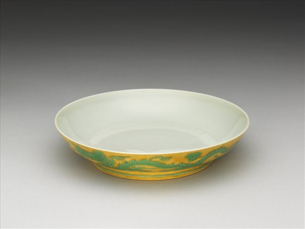 侈口,淺壁,矮圈足。外壁刻畫雙龍戲珠紋,足刻淺線一道。嬌黃釉,花紋加填綠彩。內面純白,樸素無紋飾。底有青花書「正德年製」二行四字楷款,外加雙圈。