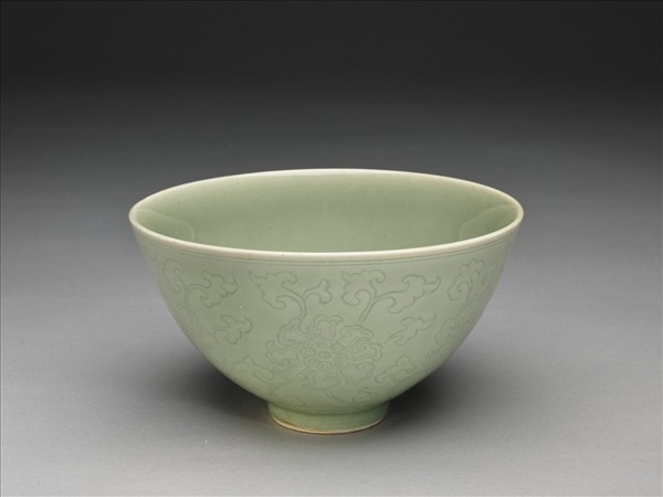 敞口,深壁上豐下斂,尖底,矮圈足,俗稱「蓮子碗」。胎體輕薄,釉色淺而灰白均勻。以劃花為飾,內壁光素無紋,外壁口沿刻弦紋二道,腹部刻纏枝番蓮紋、變形花卉。足底平切露白胎。