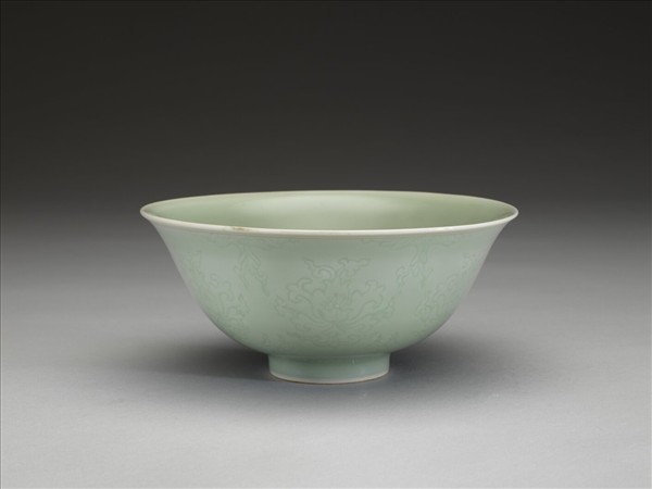 侈口窄唇,深壁,矮圈足。胎骨稍厚,通體施滿翠青色釉。以劃花為飾,內壁光素無紋,外壁口沿刻弦紋二道,腹部劃番蓮六朵。足底平切露白胎。