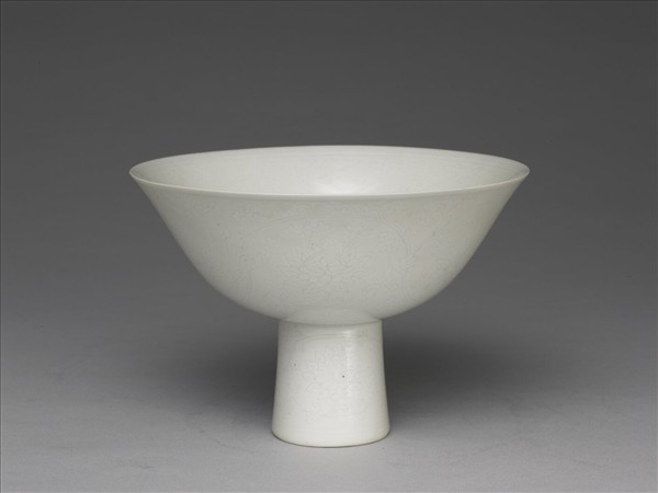 撇口,弧壁,高圈足,足部上窄下寬且中空,近底處微外侈。通體施白釉,內、外壁飾纏枝番蓮六朵,足壁亦飾纏枝番蓮紋,高足上部與碗底接合處飾蓮瓣紋一周,內、外口沿及足下部各加飾細線二道。紋飾以淺灰色線條勾勒輪廓,發色均勻,故製造出仿如透雕的浮凸效果。胎壁勻薄,足底露胎。碗心有「大清乾隆年製」雙行六字楷款,外加雙圈。