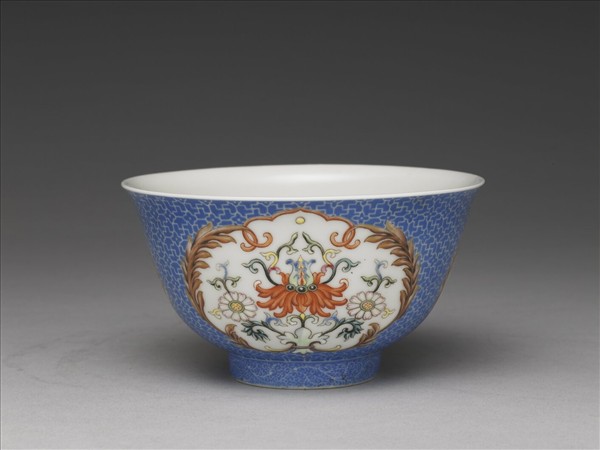 撇口,弧壁,淺圈足。外壁藍地上錐刻卍字錦花紋,圈足壁上則錐刻卷草紋,口緣及足緣一周留白;腹部餘隙三開光,以月桂與如意紋交纏如月桂冠造型為框飾,內畫盛開的橘紅西番蓮,兩旁各繪一朵粉色菊花。碗心繪桃實、折枝茉莉於白地之上。足底露胎,底書「大清乾隆年製」六字三行篆書款。院藏此類茶鍾共十對。