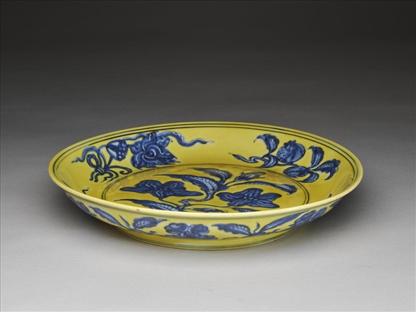 侈口窄唇,淺壁,矮圈足。內壁畫青花石榴、葡萄等四種果實,盤心畫玉蘭一枝。外壁畫轉枝牡丹花七朵。內外分畫青線十道。原為白地青花,加施黃釉一層。底有青花書「大明弘治年製」二行六字楷款,外加雙圈。