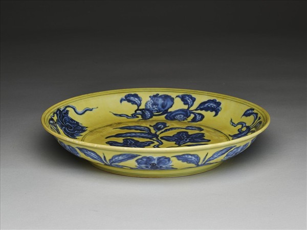 侈口窄唇,淺壁,矮圈足。內壁畫青花石榴、葡萄等四種果實,盤心畫玉蘭一枝。外壁畫轉枝牡丹花七朵。內外分畫青線十道。原為白地青花,加施黃釉一層。底有青花書「大明弘治年製」二行六字楷款,外加雙圈。