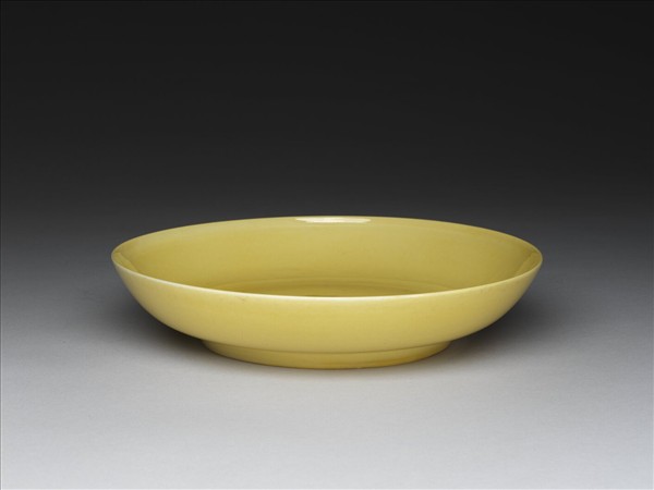 侈口,淺壁弧形,矮圈足。胎質較薄,器內外壁滿施嬌黃釉,盤底純白,樸素無紋飾。底有青花書「大明弘治年製」二行六字楷款,外加雙圈。