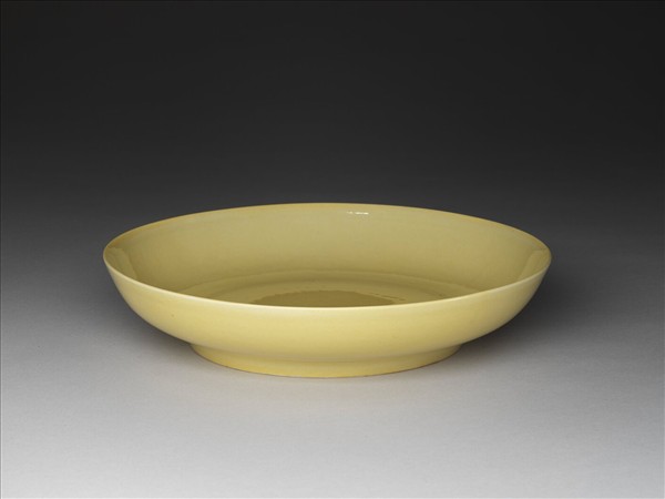 侈口,淺壁弧形,矮圈足。胎質較薄,器內外壁滿施嬌黃釉,盤底純白,樸素無紋飾。底有青花書「大明弘治年製」二行六字楷款,外加雙圈。