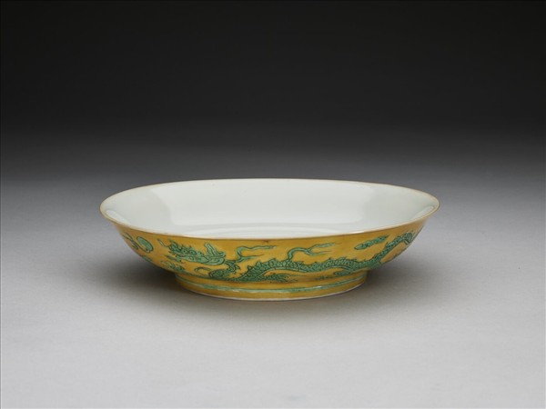 侈口,淺壁,矮圈足。外壁刻畫雙龍戲珠紋,足刻淺線一道。嬌黃釉,花紋加填綠彩。內面純白,樸素無紋飾。底有青花書「大明嘉靖年製」二行六字楷款,外加雙圈。