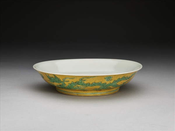 侈口,淺壁,矮圈足。外壁刻畫雙龍戲珠紋,足刻淺線一道。嬌黃釉,花紋加填綠彩。內面純白,樸素無紋飾。底有青花書「大明嘉靖年製」二行六字楷款,外加雙圈。