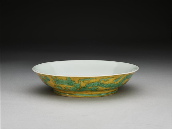 侈口,淺壁,矮圈足。外壁刻畫雙龍戲珠紋,足刻淺線一道。嬌黃釉,花紋加填綠彩。內面純白,樸素無紋飾。底有青花書「大明嘉靖年製」二行六字楷款,外加雙圈。