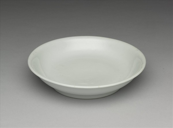 盤,侈圓口,窄唇,淺弧壁,矮圈足。內壁錐拱雲龍二條,盤心劃雲紋三朵,外壁樸素無紋飾;胎骨較厚,全器施白釉,釉色甜白。圈足端露胎。