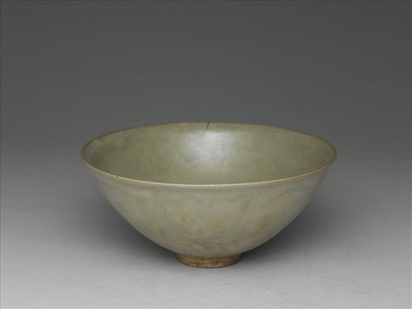 碗,侈圓口,深斜壁,矮圈足。全器施青釉,釉色灰青,口緣因流釉呈褐色。圈足及外底大部分露胎,呈灰黃色。