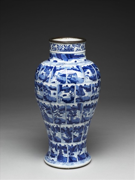 青花瓷瓶,短頸,豐肩下斂、階形底外撇、矮圈足,造型端莊,俗稱「觀音瓶」。是清康熙時期出現的瓷器類型。瓶身紋飾以線條勾勒蓮瓣形開光,再以平塗、點及線的筆法填入紋飾。取鑑西洋畫的透視技法,使遠山近水、層巒疊嶂、亭閣樓臺、小橋及叢林呈現陰陽反側的立體感。紋飾稠密,設色鮮麗,然山水亭閣畫風卻幽靜清新,為康熙時期特有的山水氣氛。本展件口沿略有傷缺,清皇室為其加裝金屬釦保護。越南頭頓號沈船(The Vung Tau Wreck,大約1690年沉沒)曾滿載類似造型及紋飾的青花瓷,原計畫前往印尼的巴達維亞港口轉運至歐洲銷售。據出水的文物推測,觀音瓶原為帶蓋的盛裝器。在清皇室中,觀音瓶則是常見的花瓶。清乾隆時期的〈緙絲歲朝圖〉即以類似的青花瓶插年節應景的梅花、茶花及靈芝。
