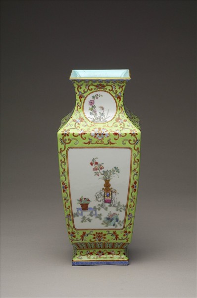方形瓶,侈口,縮頸,長腹往底部內斂,底邊內折,矮圈足外撇。內壁及圈足內施粉藍釉,器外壁青綠釉地。頸及腹四面開光,頸上開光內各畫紫色花卉與紅果實樹株;腹上開光則各畫有太平有像圖、紫牡丹、黃菊,及紅果實樹株。青綠地上滿畫纏枝番蓮紋,底邊畫一圈蓮瓣紋,足圈畫藍色回紋一道,器底心書「大清咸豐年製」雙行篆款。