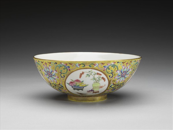 粉彩黃地博古圖碗
