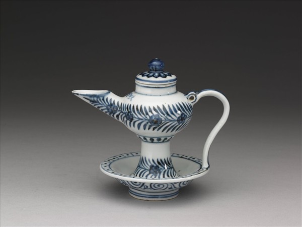模仿自伊斯蘭燈具的青花花卉燈,透露出十五世紀中國與西亞窯業交流的情景。燈壁與足部各裝飾有一橫排串枝花紋,足部之下的承盤則於邊緣畫出方格點狀紋,肩部以青花楷書「大明宣德年製」一排橫款,宣德官款的出現,被視為是官窯瓷器以皇帝年號作為款識標誌的開始。