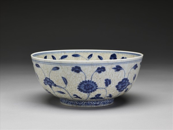 敞口,深壁,矮圈足。內壁畫牡丹、葡萄等花果六折枝,碗心畫蓮花一枝。外壁畫纏枝牡丹、菊花等八朵,足圈畫勾雲紋一周,口足內外分飾青線八道。