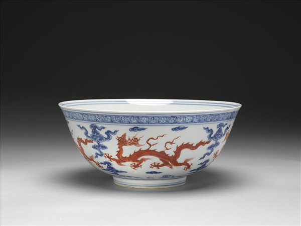 侈口窄唇,深壁,矮圈足。薄胎白釉,碗心與外壁分畫紅龍五條,隙地畫青花朵雲、十字雲紋。外壁口沿下畫青花龜背錦紋一周,底邊畫波濤紋。口足內外分飾青線九道,內壁純白無紋飾。