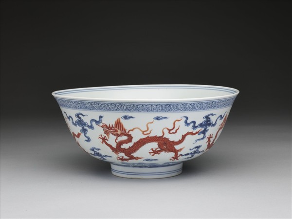 侈口窄唇,深壁,矮圈足。薄胎白釉,碗心與外壁分畫紅龍五條,隙地畫青花朵雲、十字雲紋。外壁口沿下畫青花龜背錦紋一周,底邊畫波濤紋。口足內外分飾青線九道,內壁純白無紋飾。
