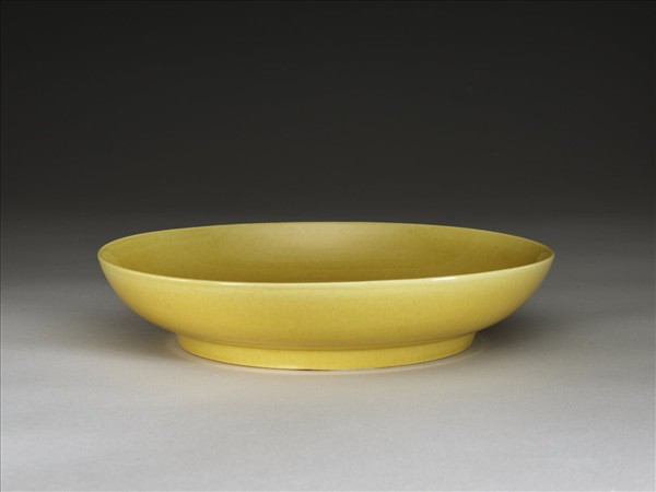 敞口窄唇,淺壁,矮圈足。胎骨稍厚,器內外壁滿施嬌黃釉,盤底純白,樸素無紋飾。底有青花書「大明嘉靖年製」二行六字楷款,外加雙圈。