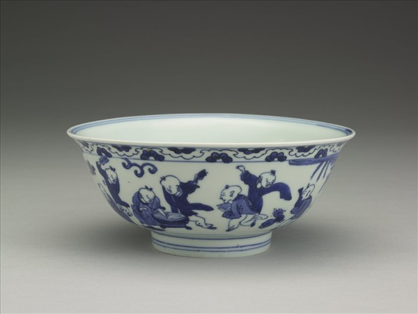 在庭園的角落中,以湖石芭蕉相隔,繪有孩童十二人,手持瓶、杯、書等物。嘉靖時期的嬰童天庭飽滿、後腦奇凸,經常身著深色長袍,淺色褲子,十分具有時代特色。