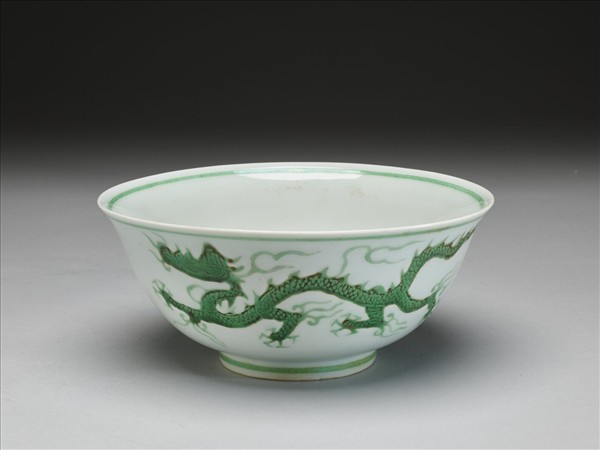 侈口窄唇,深壁,矮圈足。碗心與外壁刻畫雲龍三條,外壁隙地淺劃山石、波濤紋。內壁純白,樸素無紋飾,薄胎白釉,龍紋加填綠彩。底有青花書「大明正德年製」二行六字楷款,外加雙圈。