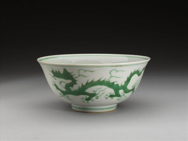 侈口窄唇,深壁,矮圈足。碗心與外壁刻畫雲龍三條,外壁隙地淺劃山石、波濤紋。內壁純白,樸素無紋飾,薄胎白釉,龍紋加填綠彩。底有青花書「大明正德年製」二行六字楷款,外加雙圈。