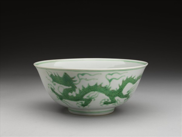 侈口窄唇,深壁,矮圈足。碗心與外壁刻畫雲龍三條,外壁隙地淺劃山石、波濤紋。內壁純白,樸素無紋飾,薄胎白釉,龍紋加填綠彩。底有青花書「大明正德年製」二行六字楷款,外加雙圈。