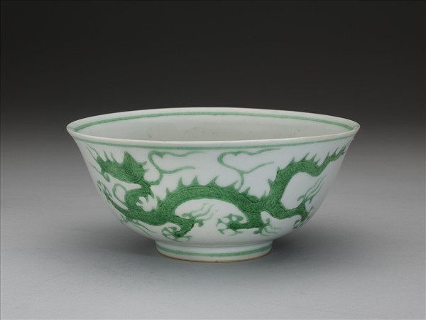 侈口窄唇,深壁,矮圈足。碗心與外壁刻畫雲龍三條,外壁隙地淺劃山石、波濤紋。內壁純白,樸素無紋飾,薄胎白釉,龍紋加填綠彩。底有青花書「大明正德年製」二行六字楷款,外加雙圈。