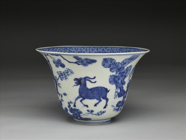 撇口,矮圈足。內口緣畫菱形紋錦一圈,間飾青線二道。碗心繪麒麟一隻,外加雙青線。外壁畫羊三隻,與天上的太陽共同組成「三羊開泰」的圖案,背景間飾松、竹、柳、湖石等。口沿至底足共畫青線五道。底青花楷書「大明嘉靖年製」,外加雙圓圈。