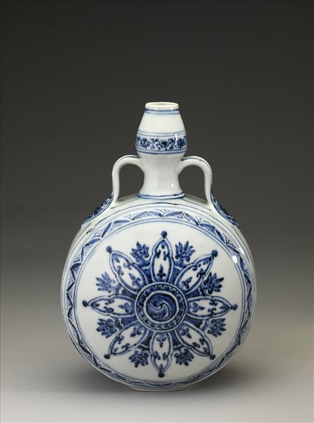 綬帶耳扁壺是明代永樂、宣德時期生產不輟的器形。扁壺器呈葫蘆形,上半部直口斜壁,中間頸部收束,下半部腹部扁圓,器腹中央有一道明顯接痕,器底帶橢圓形淺圈足,器身上部左右兩側各以綬帶形耳連接肩頸。器身上以青料繪畫轉枝花草紋及幾何花卉紋飾。這類器物主要在行旅往來之時使用,器形可以看到馬木路克王朝(Mamluk Dynasty, 1250-1517)金屬器及陶器的影響。上方漸收的口部,可以防止裝盛於其內的水等液體在行進間向外溢出,兩側的雙繫耳可以用來綑綁繩索,可然後吊繫於人、馬、駱駝之上,方便移動。
